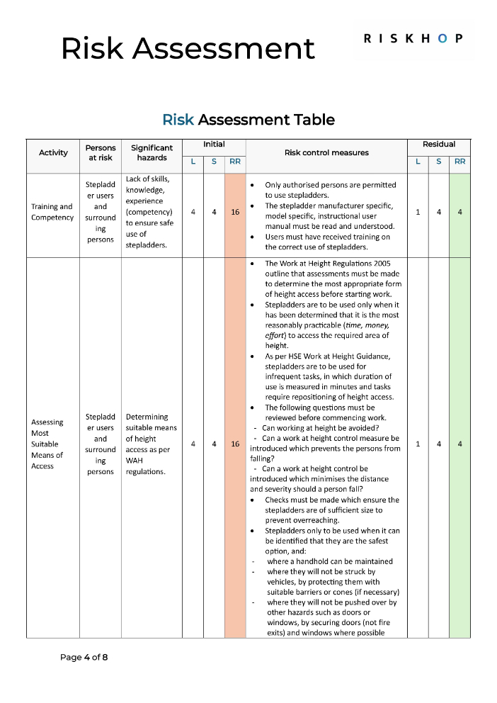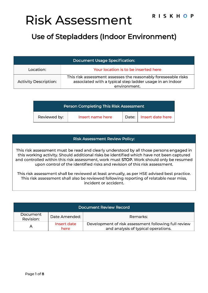 This document is 8x pages in total provides a complete risk assessment for the use of stepladders in indoor environments. It explains the typical risks involved, applies a structured risk matrix with numerical ratings and control measures, and follows the Health and Safety Executive’s (HSE) five-step approach to risk assessment.